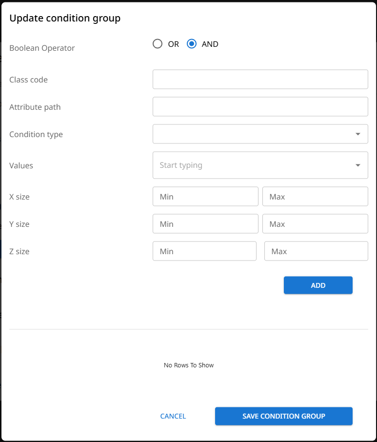 Within the Update Condition Group window, specify how the classification of an element will be defined from its model properties.