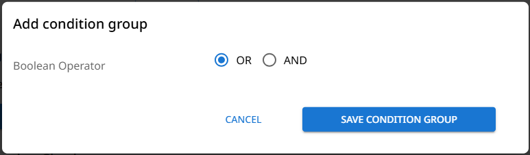 Selecting the Boolean Operator; this selection determines how the subsequent conditions will be treated within the class definition logic. Once selected, click 'Save Condition Group'.