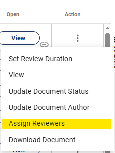To assign users as Reviewers or Review Coordinator, users within the Doc Controller Admin user group can use the 'Assign Reviewers' action available with in the action list against teh document.