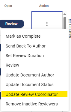 Review Coordinators can be updated by the currently assigned Review Coordinators of the document, or by users within the Doc Controller Admin group, through using the 'Update Review Cooridnator' action within the document's action list.