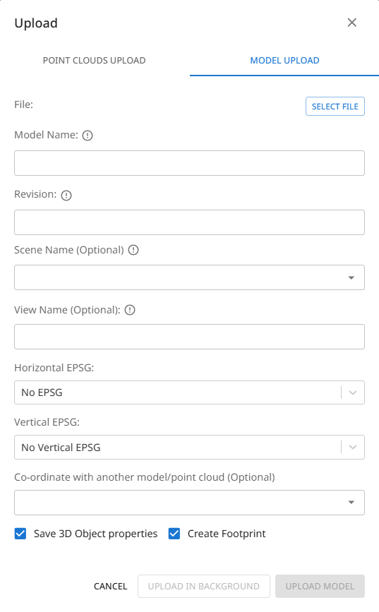 Scene Name (Optional): If you intend to upload multiple models (and/or point clouds), that will form a complete scene together, you can enter the same scene name for each upload. When A model from that scene is then loaded into the view, all other files associated to that scene will also load. This is a good way to keep federated models grouped.