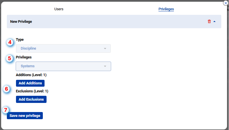 After selecting a Privilege, you will see the options to either include additions to your selection, or exclusions. This allows flexibility when setting privileges
